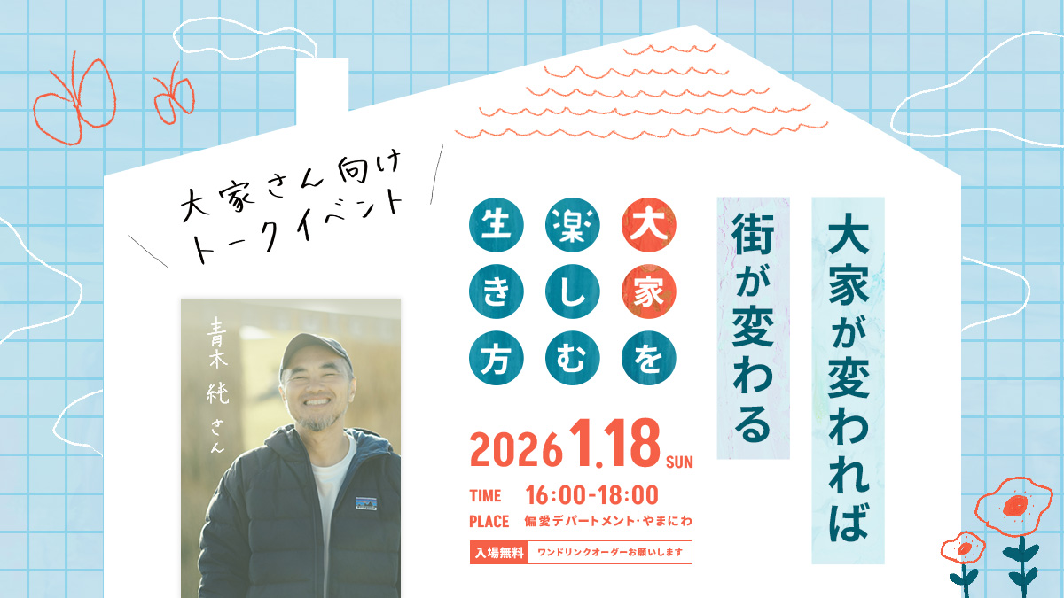 そこで今回のイベントでは、練馬区の青豆ハウスなどで理想的な「大家業」を営まれている青木純さんにお越しいただき、大家さんの楽しさをたっぷりお話いただきます。