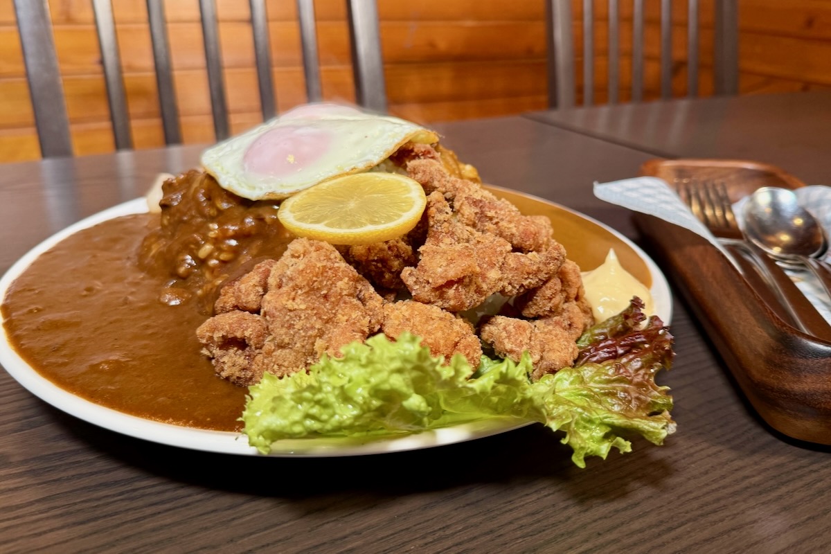 3人前はありそうなボリュームのカレーで、目玉焼きと唐揚げまでのっています。見た目とボリュームがまさに外道。