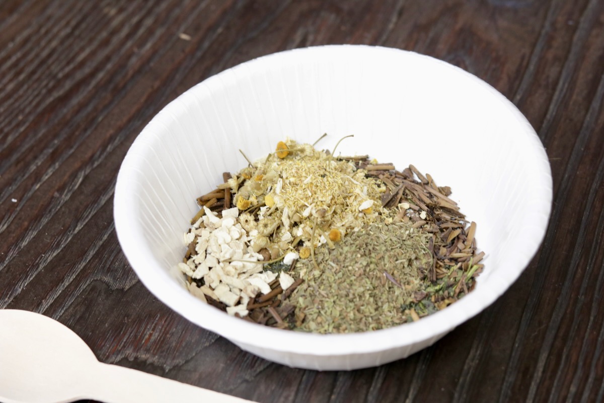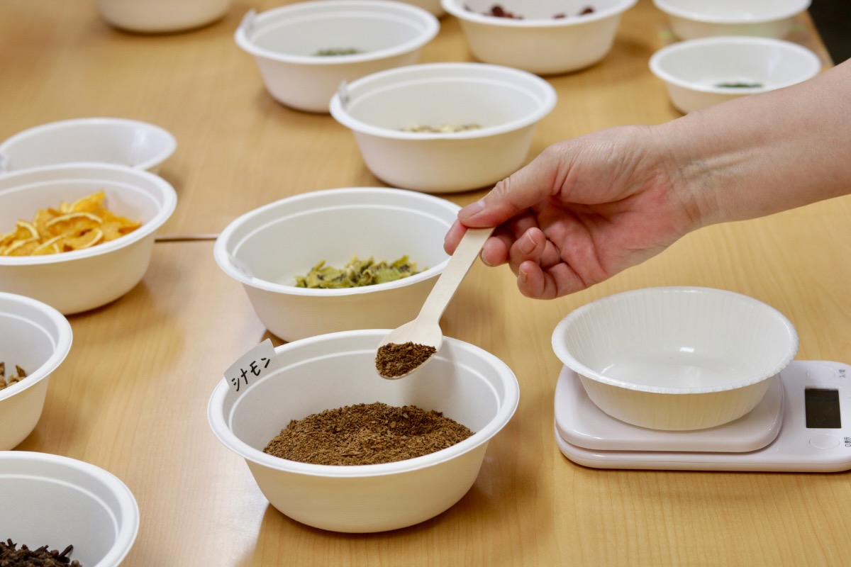 そのあとは、実際にオリジナルスパイスティーづくりを体験。用意されたのは、煎茶・ほうじ茶・和紅茶のほか、スパイスやドライフルーツなど、全部で約20種類。