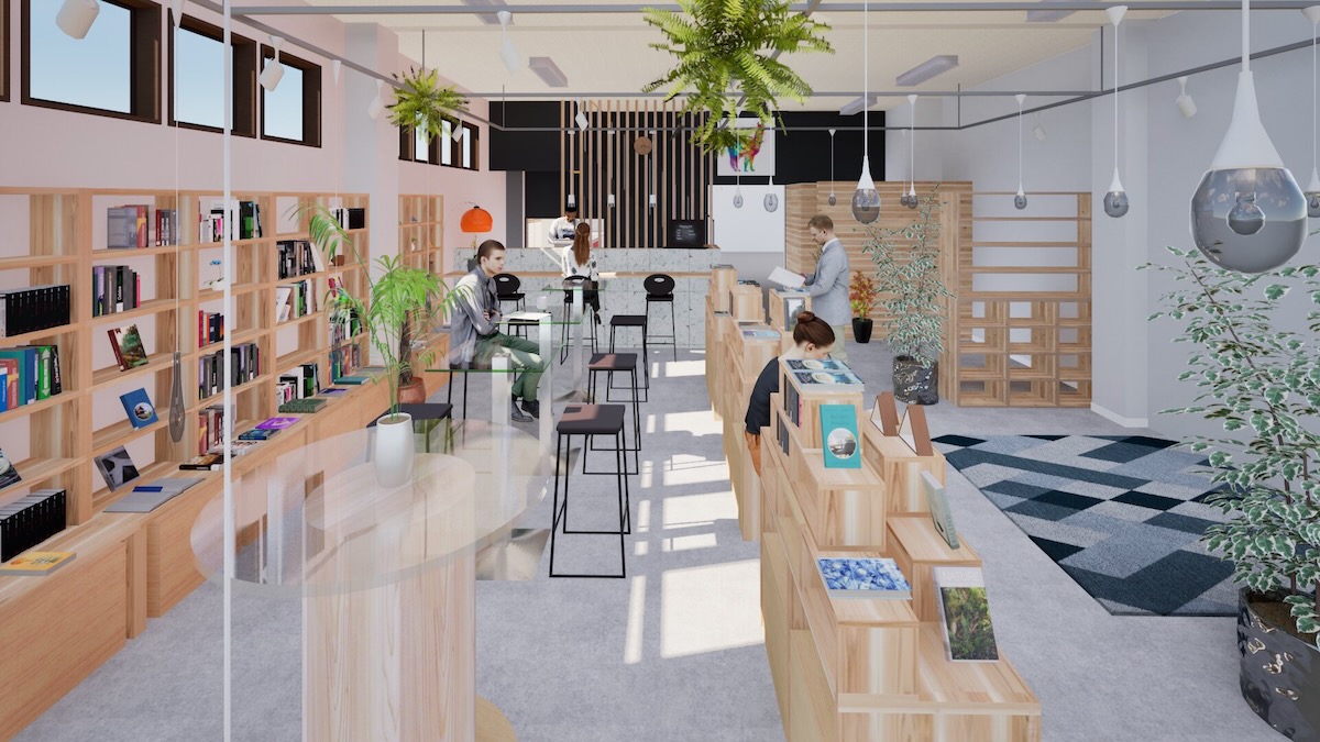 1階のエントランスを入ってすぐ左側には、ブックカフェ「本とビール・カモシカ」が入居。